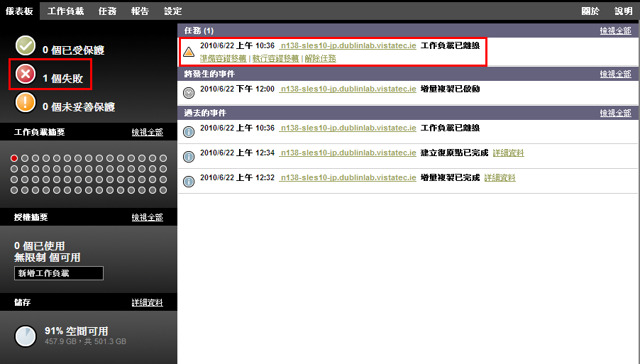 下圖顯示偵測到工作負載失敗時 PlateSpin Protect Web 介面的「儀表板」頁面。請注意「任務和事件」窗格中的相應任務︰