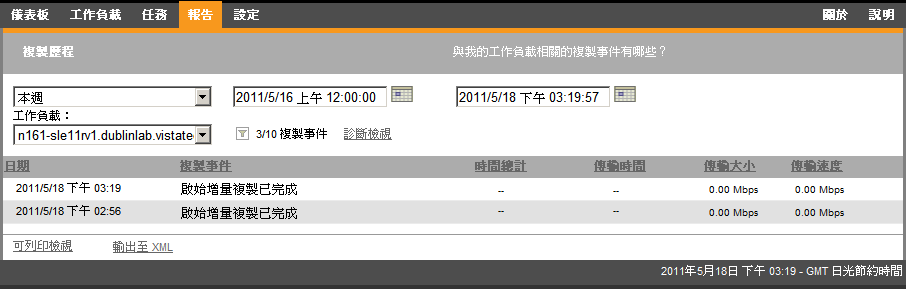複製歷程︰ 報告可選時間段內每個可選工作負載的複製類型、大小、時間和傳輸速度。