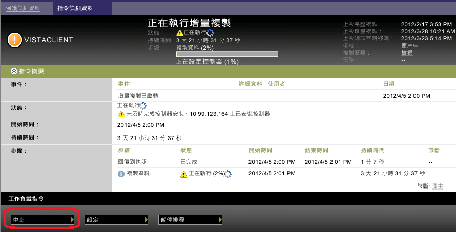 當某個特定指令執行後或正在執行時,您可以在該指令的「指令詳細資料」頁面將其中止。