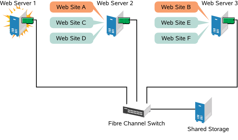 假設您己經設定一個含有三台伺服器的叢集,而這三台伺服器上都已安裝了 Web 伺服器。叢集中的每個伺服器都代管兩個網站。每個網站上的所有資料、圖形以及網頁內容都儲存在與叢集中的每一個伺服器相連接的共享磁碟子系統上。以下的圖解可以描繪這個設定的可能外觀。