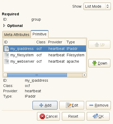 如果不想為群組新增更多原始資源,請按一下。下一個視窗會顯示已為該群組定義的參數摘要。其中會列出群組的與。索引標籤中資源的位置表示該資源在叢集中的啟動順序。