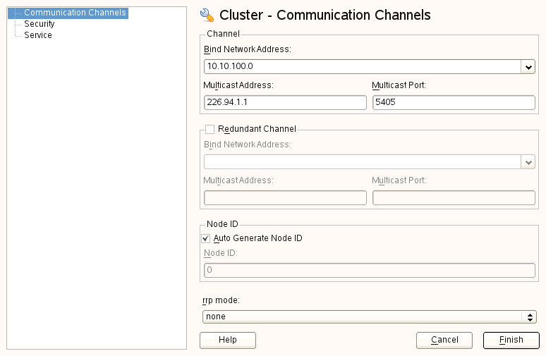 在類別中,設定用於在叢集節點間通訊的通道。此資訊將寫入到 /etc/ais/openais.conf 組態檔案中。