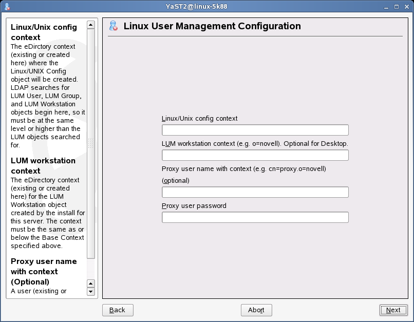 若要在 SUSE Linux Enterprise Desktop 安裝過程中安裝及設定 LUM,請在「使用者驗證方式」頁面中選取作為驗證方式,並完成下列步驟 3至步驟 10。 若尚未安裝,會提示您安裝 yast2-linux-user-mgmt 套件。
