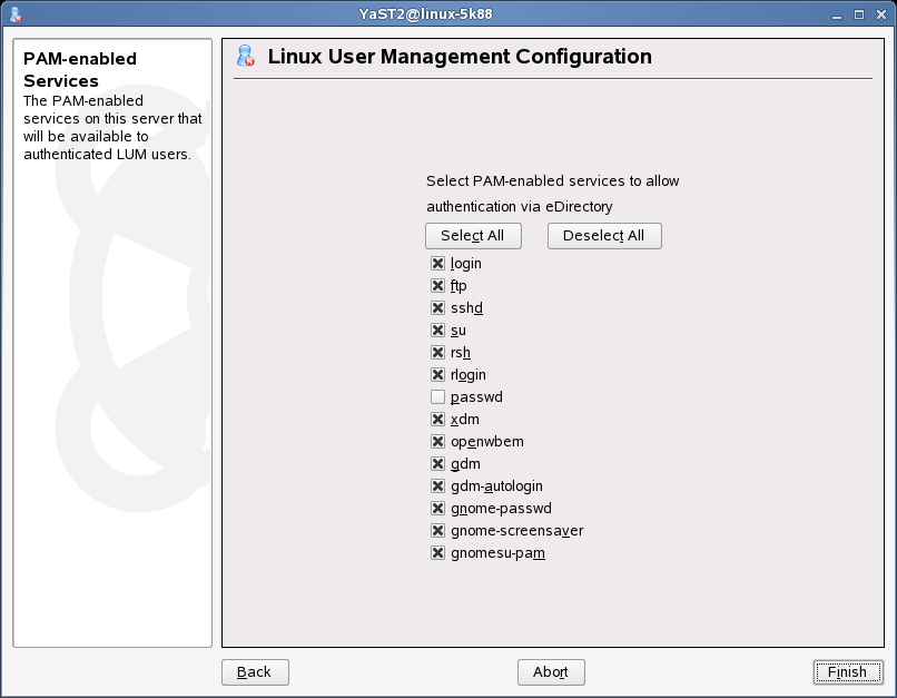 安裝並設定 LUM 技術,會設定 SUSE Linux Enterprise Desktop 工作站,以對照 eDirectory 中儲存的使用者帳戶資料,驗證登入要求。使用者必須具備以 iManager 與 LUM 延伸建立的 eDirectory 使用者帳戶,且其使用者物件必須與要登入的工作站相關聯,才能登入。 如需相關資訊,請參閱節 34.2, 使用 iManager 讓使用者通過 eDirectory 驗證。