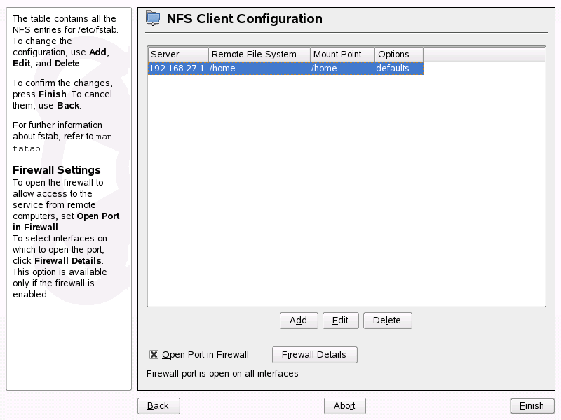 被授權的使用者可從 NFS 伺服器裝載 NFS 目錄到自己的檔案目錄樹。 使用 YaST 模組是最簡單的達成方式。 僅需鍵入 NFS 伺服器的主機名稱、要輸入的目錄和在本地裝載此目錄的裝載點。 在第一個對話方塊中,按一下之後便可完成。 按一下開啟防火牆,可從遠端電腦存取服務。 防火牆的狀態顯示於核取方塊旁。 您可以按一下來儲存變更。請參閱使用 YaST 的 NFS 用戶端組態。