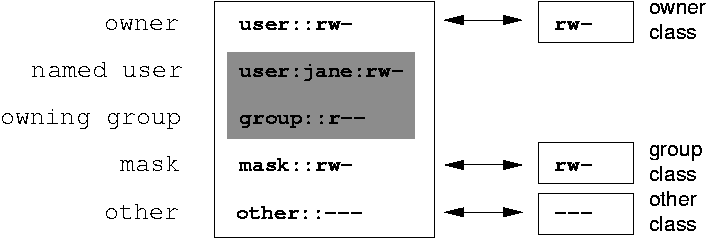 ACL 有兩種基本類別:最小值 ACL 只包含擁有者、所屬群組和其他類別的項目,這對應於檔案和目錄的傳統許可權位元。延伸 ACL 則不僅如此。它必須包含遮罩項目而且可以包含命名使用者和命名群組類型的多個項目。