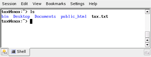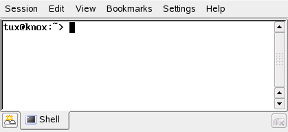 這樣畫面就會出現 Konsole 或是 GNOME 終端機視窗,並在第一行顯示提示文字,如 圖 15-1 所示。這段提示文字通常會顯示您的登入名稱 (即本範例中的 tux)、電腦的主機名稱 (即此處的 knox),以及目前的路徑 (在此範例中就是用波狀符號 ~ 標示的根目錄)。如果您是登入遠端電腦,這段資訊就會永遠為您顯示目前您正在運作的系統。當游標出現在這個提示名稱之後,您可以將指令直接傳送給電腦系統。