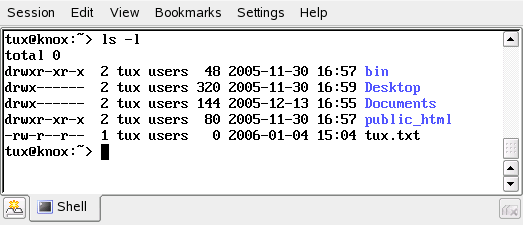 在每個物件名稱的左邊會有好幾個欄位,其中會顯示與該物件有關的資訊。最重要的是:第一欄會顯示物件的檔案類型 (在本範例中,d 是指目錄,而 - 是指一般檔案)。接下來的 9 個欄位則會顯示該物件的使用者許可權。欄位 11 和 12 則會顯示檔案擁有者和群組 (在本範例中是指 tux 和 users)。如需更多有關 Linux 使用者許可權和使用者概念的詳細資訊,請參閱節 15.2, 使用者和存取許可權。接下來的欄位會顯示檔案大小,單位是位元組。接著顯示上次變更的日期和時間。最後一個欄位則顯示物件名稱。