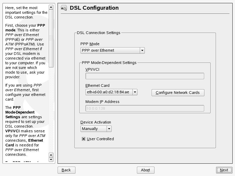 PPPoE 或 PPTP 類型的 DSL 連線組態,會要求對應的網路卡必須正確設定。 如果您尚未完成此步驟,請先選取來進行設定 (請參閱 節 30.4.1, 使用 YaST 設定網路卡)。 如果是 DSL 連線,會自動指定位址但不是透過 DHCP,因此您不可啟用選項, 而是應該輸入介面的靜態虛擬位址,例如 192.168.22.1。 在中,輸入 255.255.255.0。 如果您要設定獨立的工作站,則應保留 為空白。