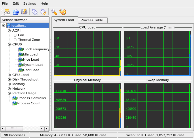 KSysguard 是獨立的應用程式,將系統中所有可測量的參數收集到一個監控環境中。KSysguard 具有 ACPI (電池狀態)、CPU 負載、網路、磁碟分割及記憶體使用率的監控程式。它還能監看及顯示所有系統程序。可自定所收集資料的顯示及篩選。透過網路可以同時監控各種資料頁的不同系統參數,或在並列埠中收集各個機器的資料。KSysguard 也能在沒有 KDE 環境的機器上做為精靈來執行。如需有關此程式的詳細資訊,請參閱其整合的說明功能或 SUSE 說明頁。