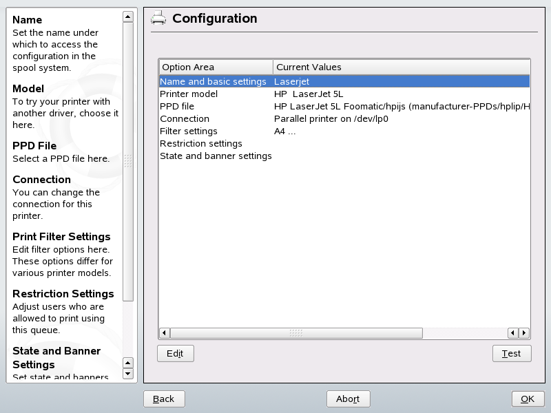 YaST 可用來設定直接連線到您機器 (一般使用 USB 或並列埠) 的本機印表機,或設定網路上列印。亦可以 YaST 將 PPD (PostScript 印表機描述) 檔案新增到您的印表機。