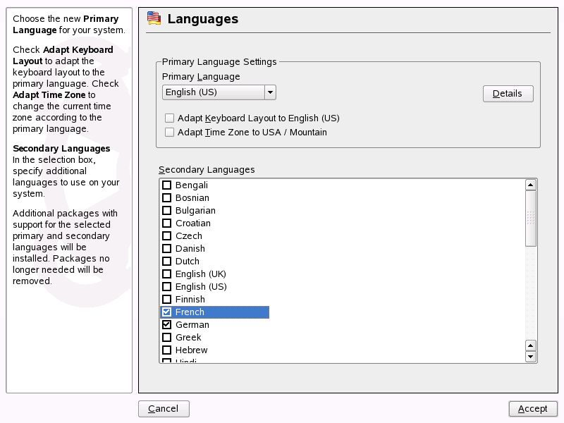 系統的主要與次要語言會在安裝時設定。然而,您可隨時使用進行變更。在 YaST 中設定的主要語言會套用到整個系統,包括 YaST 與桌面環境。這是您希望在大部分時間使用的語言。 次要語言是使用者偶而因其他目的而需要用到的語言,例如桌面語言或文字處理。