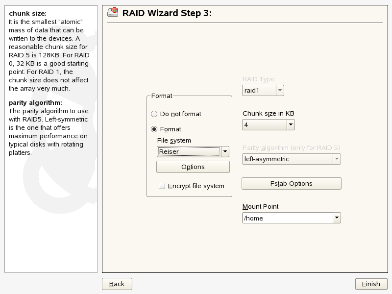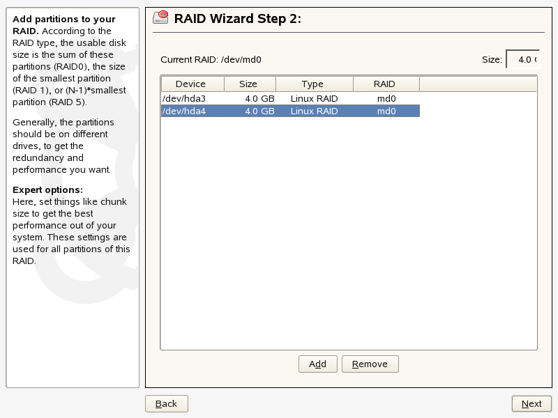 在下一個對話方塊中,在 RAID 層級 0、 1 及 5 之間選擇 (請參閱節 7.2.1, RAID 層級以取得詳細資訊)。按一下 後,下列對話方塊會列出具有 Linux RAID