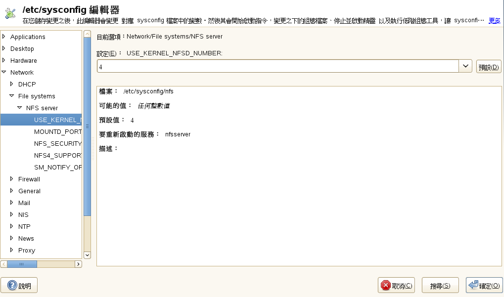如果您先前並無經驗和相關知識,請勿修改 /etc/sysconfig 檔案。它可能會嚴重破壞您的系統。/etc/sysconfig中的檔案包含每一個變數的簡短註解,說明它們的實際作用。