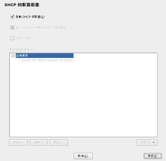除了稍早討論的組態方法外,還有進階組態模組,可讓您變更 DHCP 伺服器設定的每個細節。選取對話方塊左邊樹狀檢視中的 ,開始進階組態。