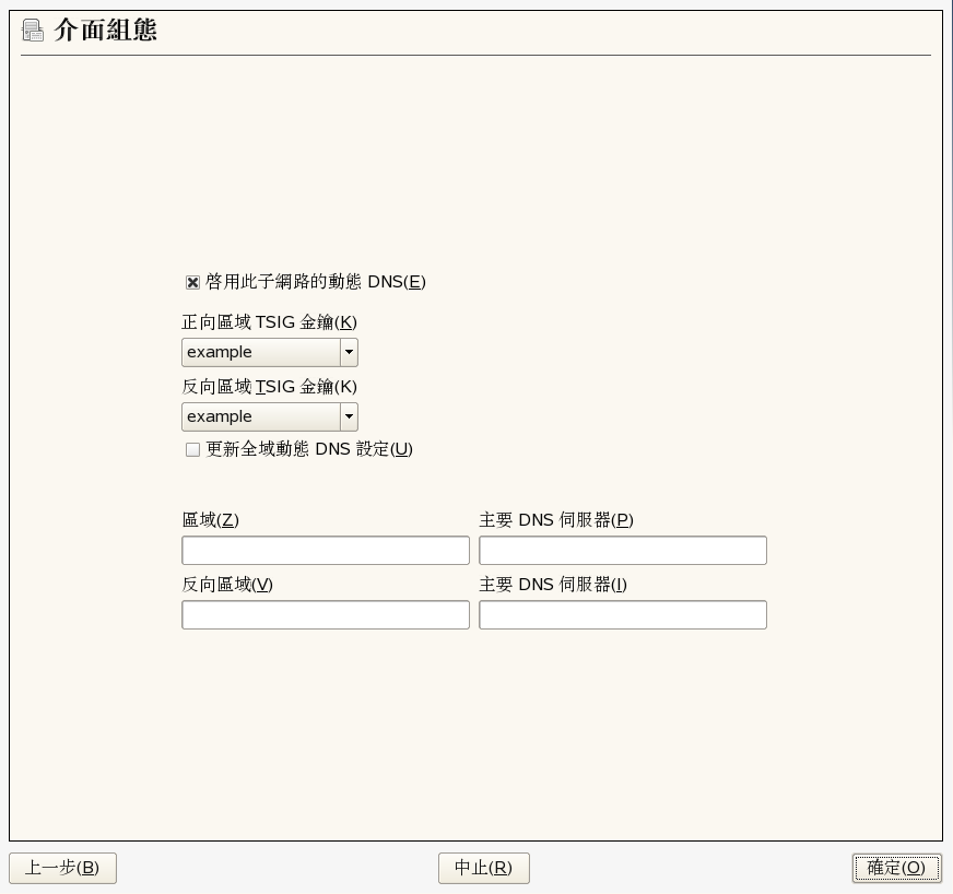 選取,即可啟用子網路的動態 DNS。執行這個動作後,使用下拉式清單選擇轉遞和反向區域的 TSIG 金鑰,確定這些金鑰對於 DNS 與 DHCP 伺服器都是相同的。使用,來依據動態 DNS 環境自動更新及調整全域 DHCP 伺服器設定。最後,定義每個動態 DNS 的哪些轉遞和反向區域需要更新,為兩個區域都指定主要名稱伺服器的名稱。如果名稱伺服器與 DHCP 伺服器在同一部主機上執行,可以將這些欄位保留空白。選取返回子網路組態對話方塊 (請參閱圖 22-8)。再次選取 返回最初的進階組態對話方塊。