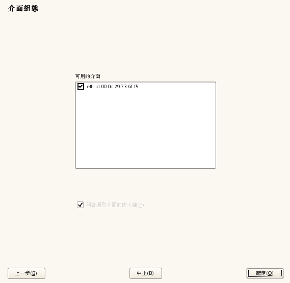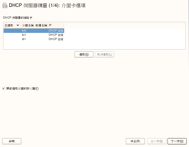 在第一步驟中,YaST 會尋找系統上可用的網路介面,然後顯示清單。從清單中選取 DHCP 伺服器要傾聽的介面,並按一下,然後選取以開啟此介面的防火牆。請參閱圖 22-1。