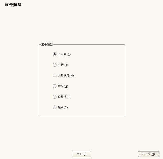 DHCP 伺服器的由數個宣告組成。此對話方塊可讓您設定宣告類型︰、、、、和。此範例顯示新子網路的選項 (請參閱 圖 22-7)。