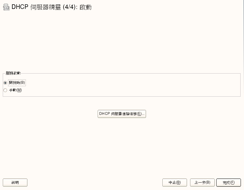 在組態精靈的第三步驟後,會顯示最後一個對話方塊,用於定義 DHCP 伺服器的啟動方式。在此您可以指定是在系統開機時自動啟動 DHCP 伺服器,還是在需要時手動啟動 (例如,為了測試)。按一下完成伺服器的組態。請參閱圖 22-4。