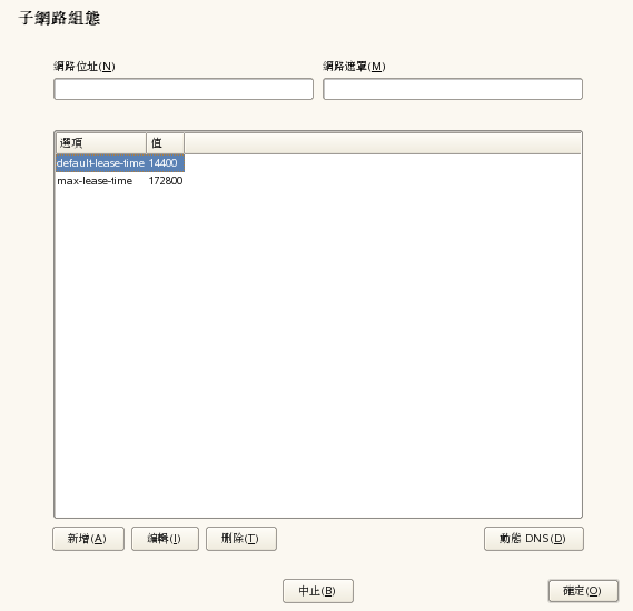 此對話方塊可讓您使用 IP 位址及網路遮罩來指定新的子網路。在對話方塊的中間部分,使用、和修改所選子網路的 DHCP 伺服器啟動選項。若要設定子網路的動態 DNS,選取 。