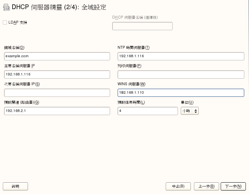 使用核取方塊決定您的 DHCP 設定是否要由 LDAP 伺服器自動儲存。在輸入欄位中提供 DHCP 伺服器應管理的所有用戶端的網路細節。這些細節包括網域名稱、時間伺服器的位址、主要及次要名稱伺服器的位址、列印和 WINS 伺服器的位址 (供同時具有 Windows 與 Linux 用戶端的混和網路使用)、閘道位址以及租用時間。請參閱圖 22-2。