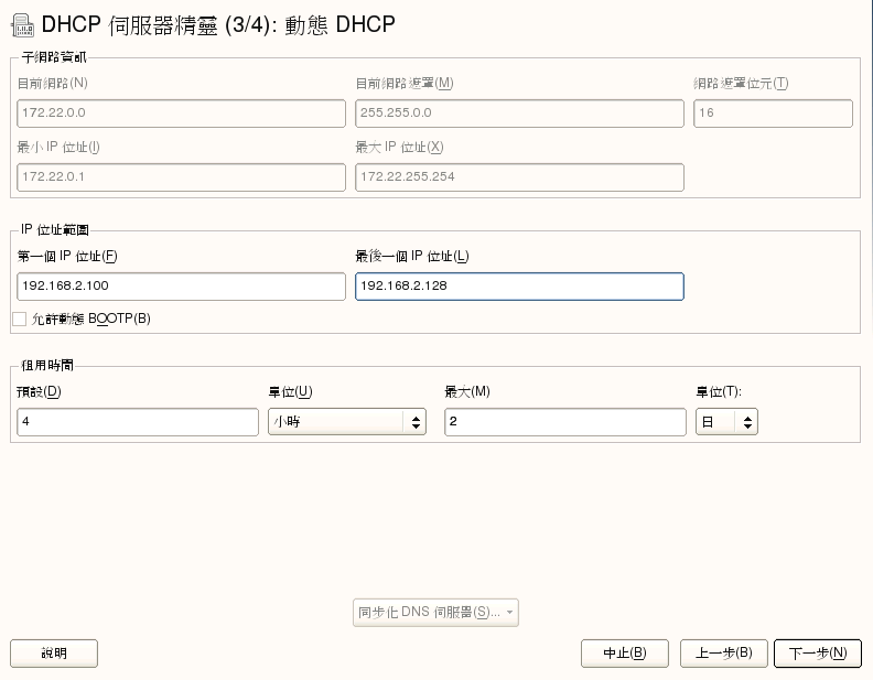 在此步驟中,設定應該如何將動態 IP 位址指派給用戶端。若要這樣做,指定伺服器可以指派位址給 DHCP 用戶端的 IP 範圍。所有這些位址應該涵蓋在相同的網路遮罩下。另外也指定租用時間,在此時間段內用戶端可以保留其 IP 位址,無需要求延續租用。或者,指定最長租用時間,也就是伺服器保留特定用戶端之 IP 位址的時間。請參閱圖 22-3。