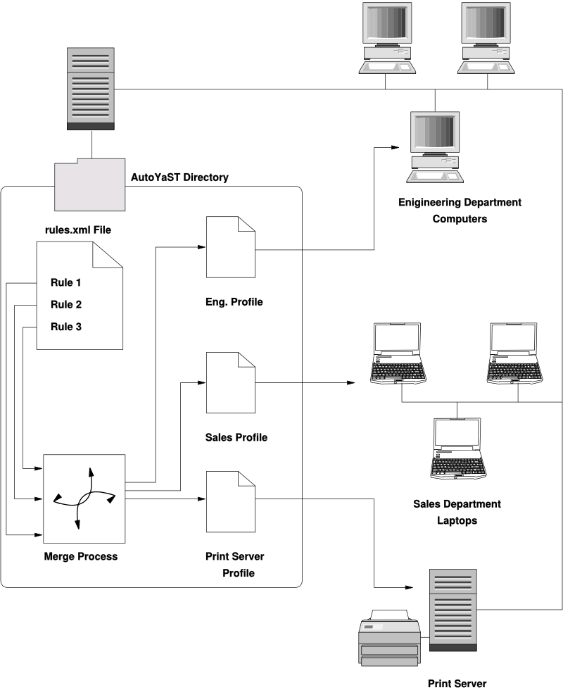 基本上,以規則為基礎的自動安裝會將數個設定檔合併成一個,來產生符合異質案例的自定設定檔。每個規則會描述設定中的一個特色 (例如磁碟大小),並告訴 AutoYaST 當規則符合時要使用哪個設定檔。描述設定中不同特色的數個規則合併在一個 AutoYaST rules.xml 檔案中。然後 AutoYaST 會處理規則堆疊,並將符合 AutoYaST 規則的不同設定檔合併成一個,來產生最後的設定檔。如需這個程序的示範,請參閱節 21.2.2, 以規則為基礎的自動安裝案例範例