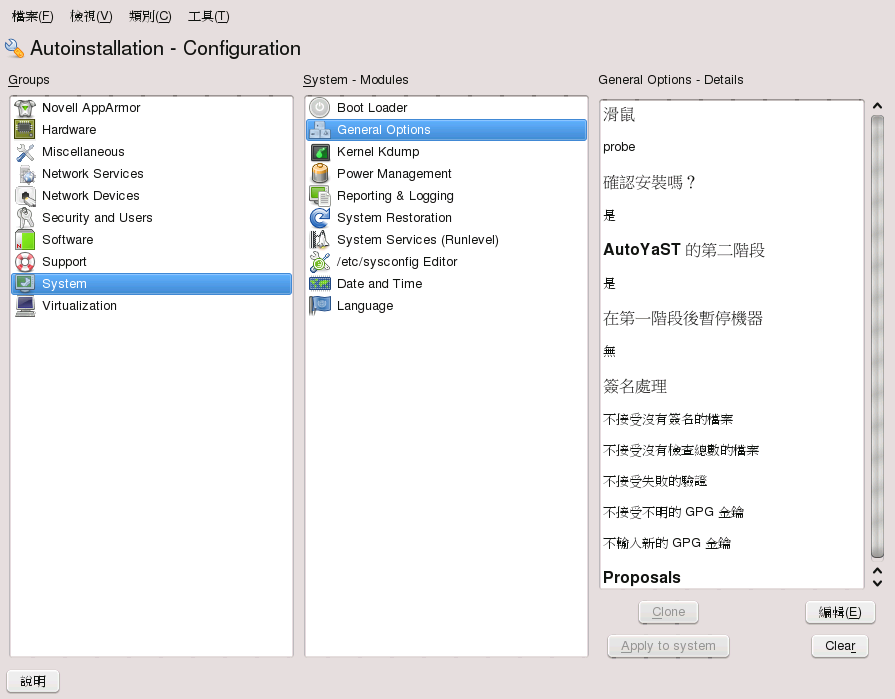 使用 AutoYaST GUI 建立和修改設定檔,以符合您的需要