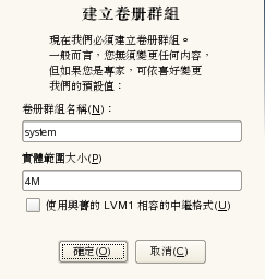 如果在系統上沒有磁碟區群組,將會提示您新增一個磁碟區群組 (請參閱圖 4-2)。可以使用來建立其他群組,但通常一個磁碟區群組已經足夠。建議使用 system 做為 SUSE® Linux Enterprise Server 系統檔案所在磁碟區群組的名稱。實體擴充大小定義了磁碟區群組中實體區塊的大小。在磁碟區群組中的所有磁碟空間都會以此大小的區塊來處理。此值通常設為 4 MB,並允許將實體及邏輯磁碟區的最大容量設為 256 GB。只有在需要大於 256 GB 的邏輯磁碟區時,才需要增加實體擴充大小的容量 (例如,設為 8、16 或 32 MB)。