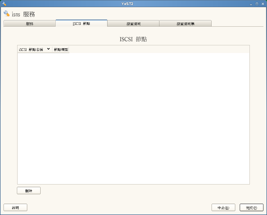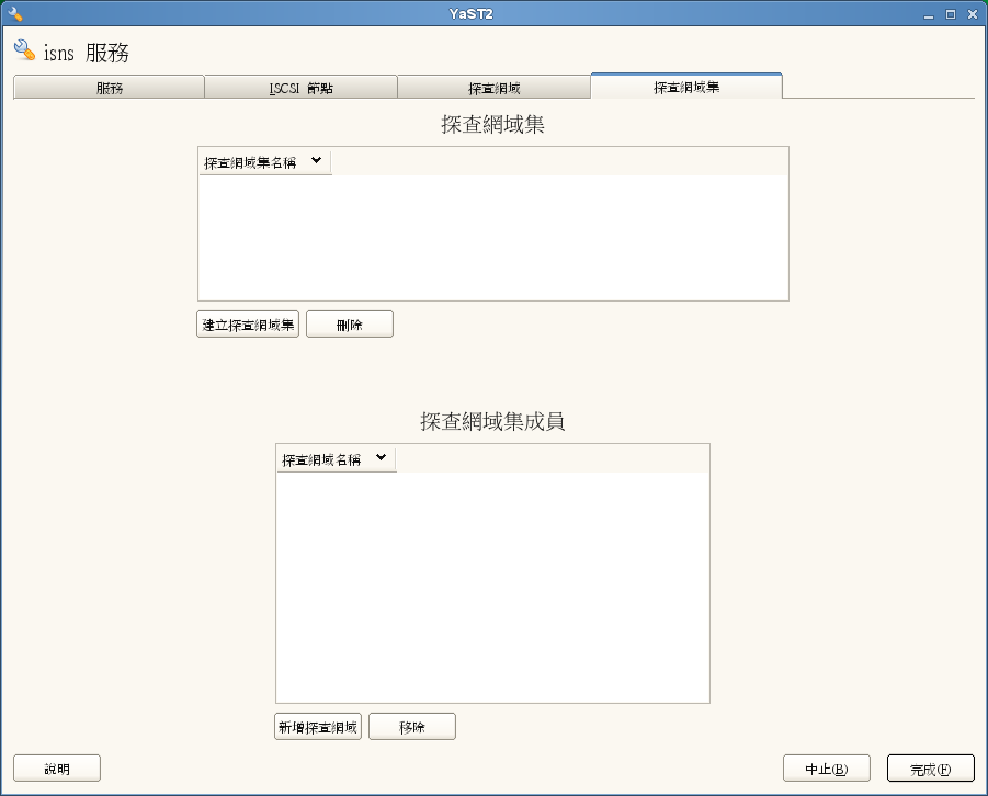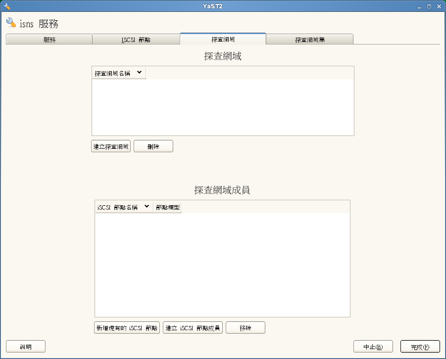 重要: 必須已安裝並執行 SNS 服務,才能設定 iSNS 探查網域。如需更多資訊,請參閱節 12.4, 啟動 iSNS。