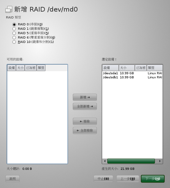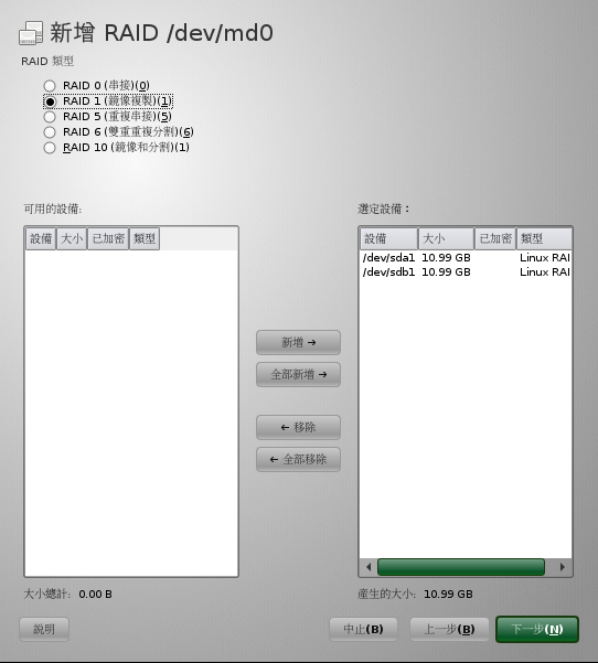 若要繼續此範例,請為 RAID 1 選取兩台設備。