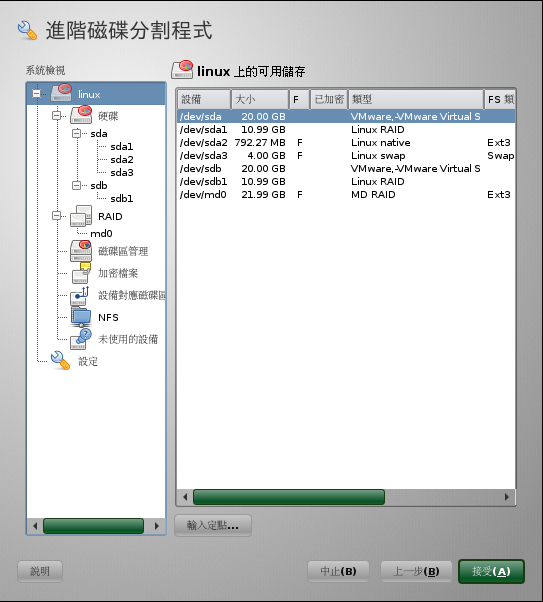 軟體 RAID 設備便會受設備對應程式的管理,並會在 /dev/md0 路徑下建立一台設備。