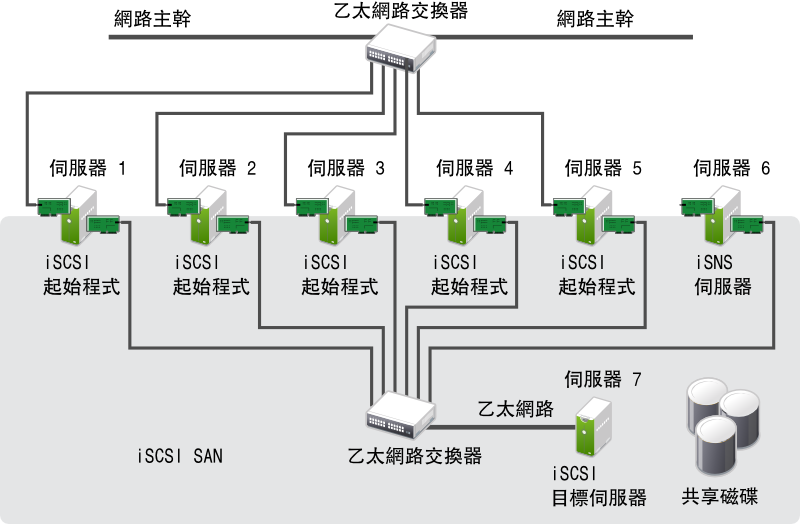 圖 13-1 配有 iSNS 伺服器的 iSCSI SAN