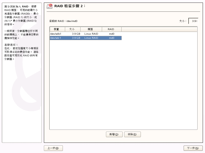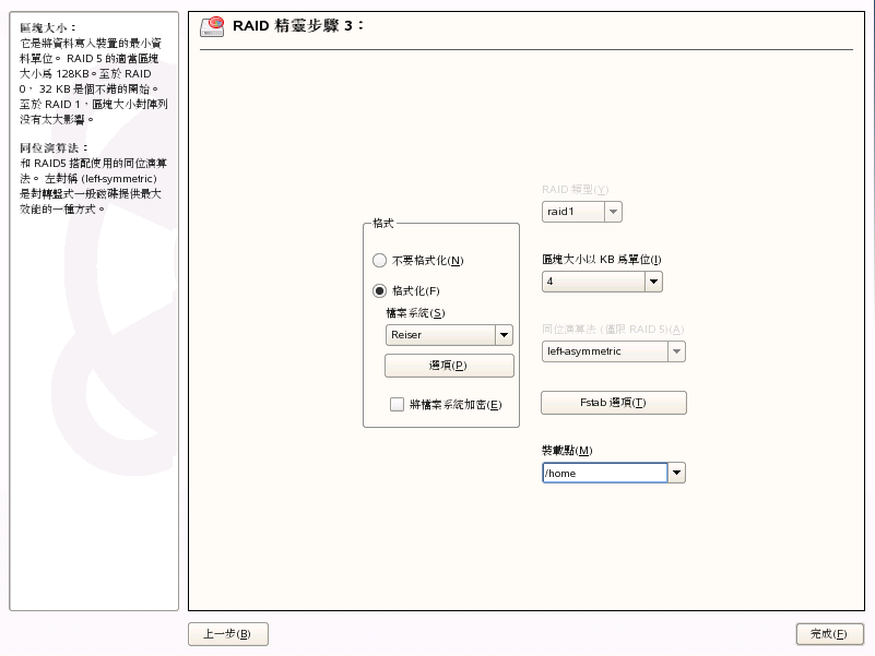 使用傳統磁碟分割時,會設定要使用的檔案系統、加密以及 RAID 磁碟區的掛接點。在按一下以完成組態之後,請參閱 /dev/md0 設備及其他在進階磁碟分割程式中以 RAID 表示的設備。