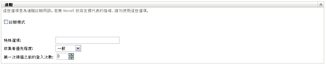警告:這些選項主要是針對進階診斷。請在 Novell 支援代表的指導之下使用這些選項。