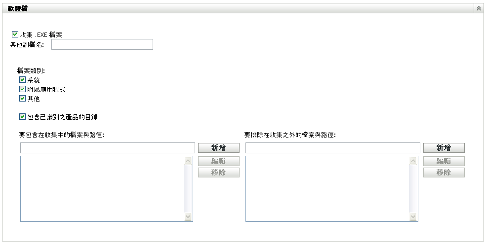 若要以包含及排除檔案及路徑的方式限制掃描範圍,請使用及指定掃描所要包含及排除的檔案與路徑,以設定收集中所要包含或排除的檔案與路徑。您也可以選取檔案或路徑,然後按一下,以編輯清單中的檔案及路徑。若在欄位中指定檔案或路徑,便會將掃描限定在該檔案或路徑上。若是在欄位中指定檔案或路徑,便會搜尋指定檔案或路徑以外的所有檔案及路徑。也會略過面板中指定的路徑。
