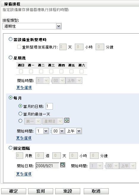 選取要在重新整理設備時、指定的星期幾、每月或依循固定間隔執行掃描。