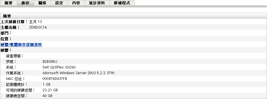 設備的庫存包含庫存掃描時所收集的硬體、軟體及使用者組資料等相關資訊。您可以使用「ZENworks 控制中心」或「ZENworks 圖示」功能表檢視此報告。