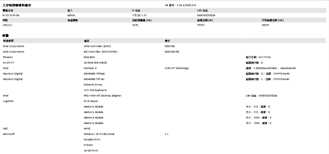 此報告會顯示設備的相關詳細資訊,包括使用者組資料、硬體資訊及軟體。按一下此頁面中的各項連結,即可取得進一步的詳細資訊。您可將報告輸出為 Excel*、CSV 或 PDF 格式。您也可以編輯所選的資料。若需要更多的資訊,請參閱節 2.5, 編輯受管理設備的庫存資料。