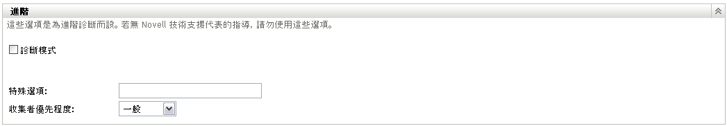 警告:這些選項主要是針對進階診斷。請在 Novell 支援代表的指導之下使用這些選項。
