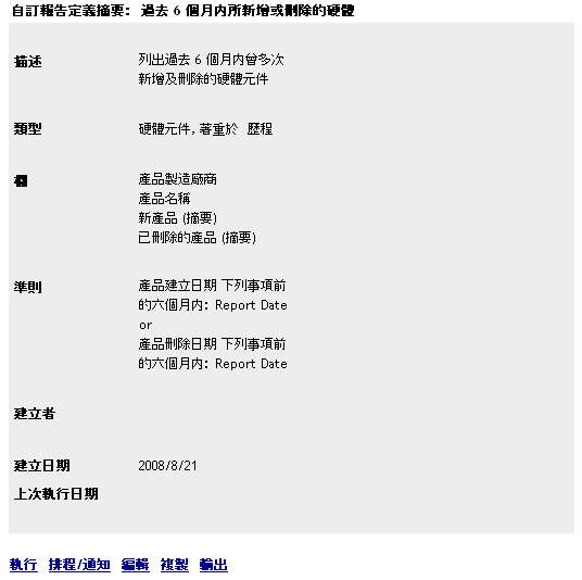 建立本地產品 (資料夾)︰ 著重於可用於建立「本地軟體產品」之軟體檔的報告。如需「本地軟體產品」的詳細資訊,請參閱節 6.0, 建立本地軟體產品。