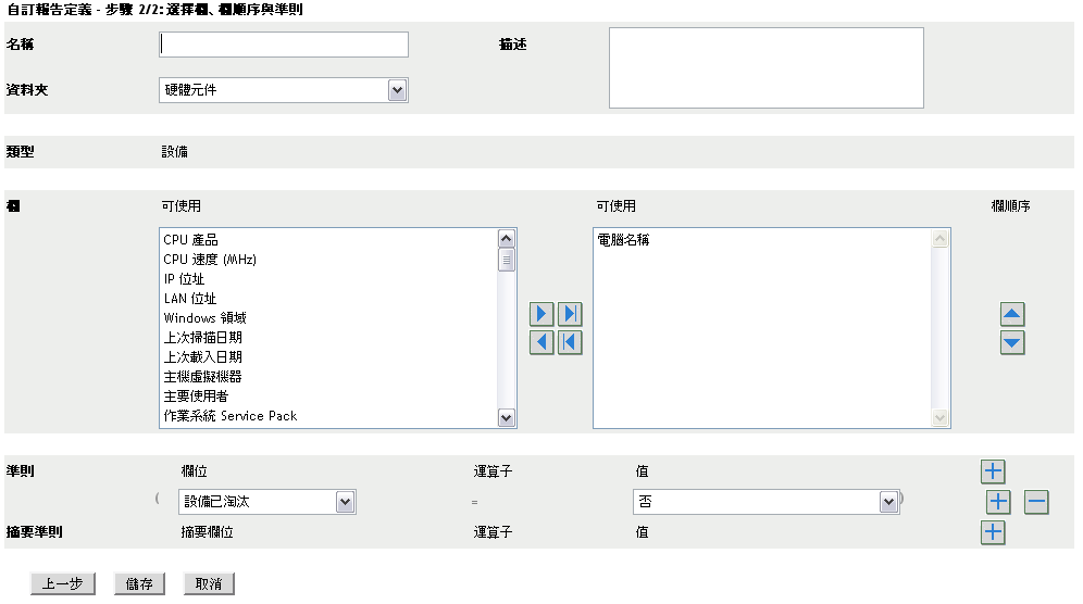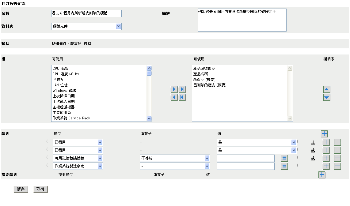 欄︰ 從左側清單中,選取要包含在報告中的資料。使用箭頭圖示可以將反白的選定資料移至右側清單中。按住 Ctrl 並點擊,可以一次選取多個選項。使用向上和向下圖示可以排列資料的顯示順序。