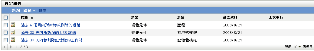 依排程執行的報告會儲存在資料庫中。您可以依日期或標題檢視這些報告。如需排程報告的資訊,請參閱節 8.2.4, 排程自定報告並傳送通知。