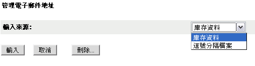 「組態」頁面的「電子郵件地址」面板可讓您輸入在自定報告備妥時傳送通知的目標電子郵件地址,在報告定義中設定。先前輸入的電子郵件地址,會連同使用者的名字、姓氏與中間名列示於面板中。