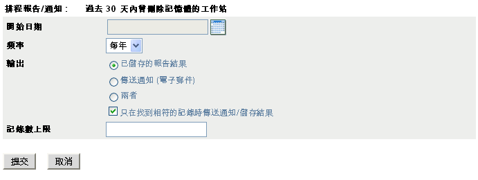 輸出︰ 選擇是否儲存報告、是否在報告準備就緒時傳送電子郵件通知,或同時執行兩者。您也可以選擇只在找到相符的記錄時儲存結果或傳送通知。如需設定電子郵件地址的資訊,請參閱節 8.2.5, 設定電子郵件地址。