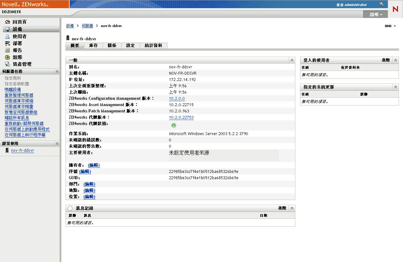 每一部 ZENworks 伺服器與 ZENworks 調適性代辦皆會建立其相關活動的記錄。這些訊息會顯示在「ZENworks 控制中心」的各個區域中: