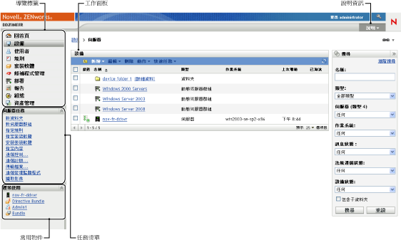 工作面板: 工作面板是可讓您監看及管理 ZENworks 系統之處。這些面板會依目前頁面而有所不同。上文的範例中共有兩個工作面板:與。面板列出了伺服器、資料夾、伺服器群組和已建立的動態伺服器群組;您可以使用此面板來管理伺服器。面板可讓您根據伺服器的名稱、作業系統或狀態等準則,過濾「設備」面板。