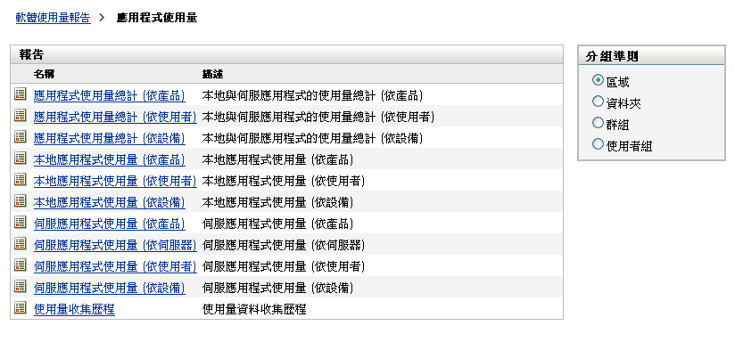 此外還有許多其他標準的及預先定義的自定報告可供您使用。如需應用程式使用量報告的其他資訊,請參閱ZENworks 10 資產庫存參考。