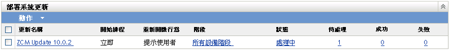 「部署系統更新」面板顯示部署更新的進度以及結果。