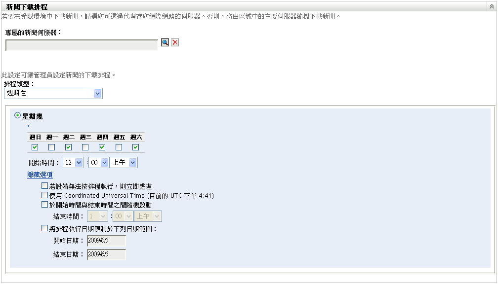 將排程執行日期限制於下列日期範圍: 除了其他選項之外,還可指定進行新聞更新檢查的日期範圍。
